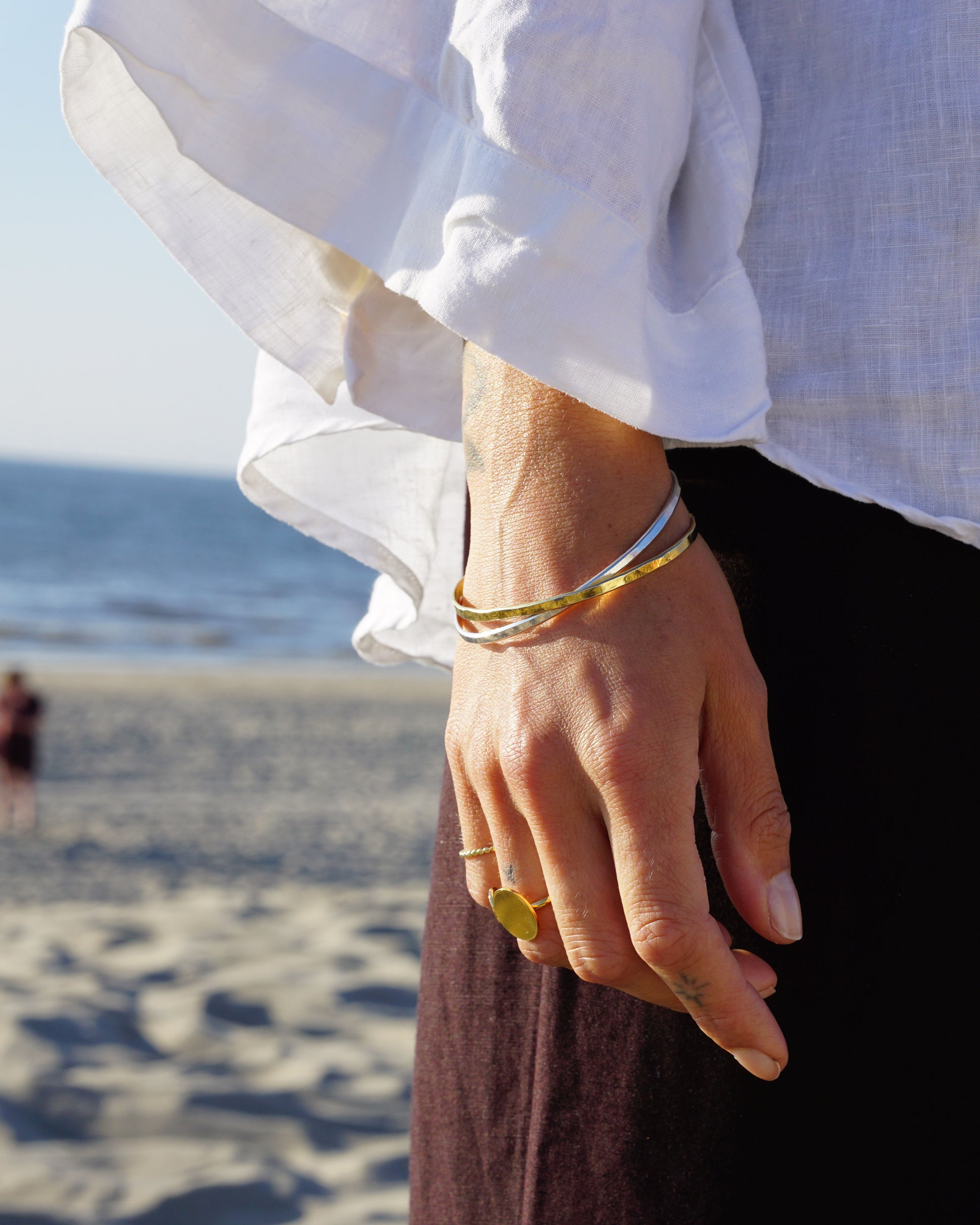 The bracelet ancient thick is a bit wider, which makes it stand out nicely and can also be worn alone. This bracelet you slide over your wrist, we also call this a bangle. Due to the oval shape, it falls nicely on your arm. Make sure you put it on across your hand.