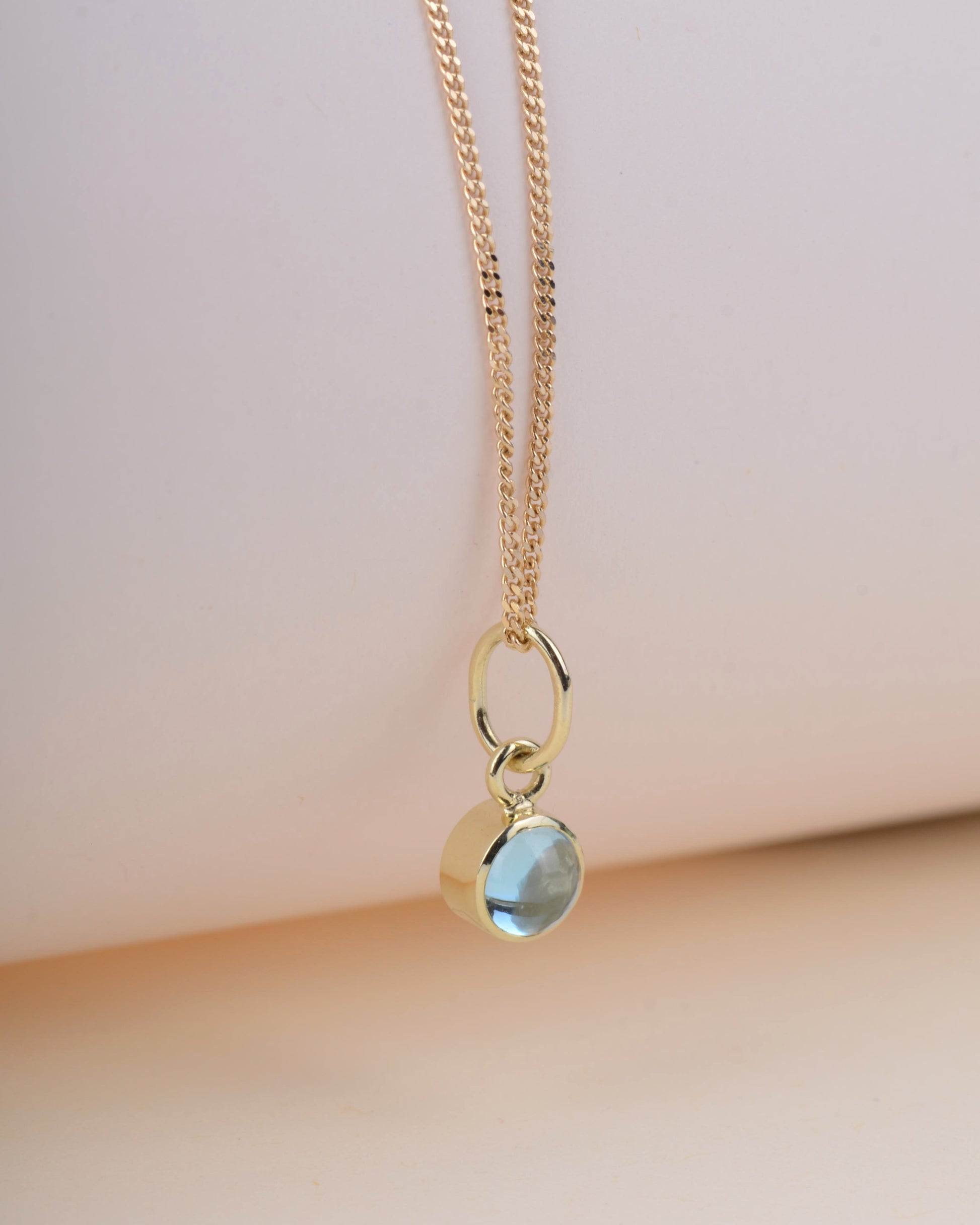 Een mysterieuze blauwe topaas in geelgouden zetting. Een prachtjuweel voor aan een ketting.