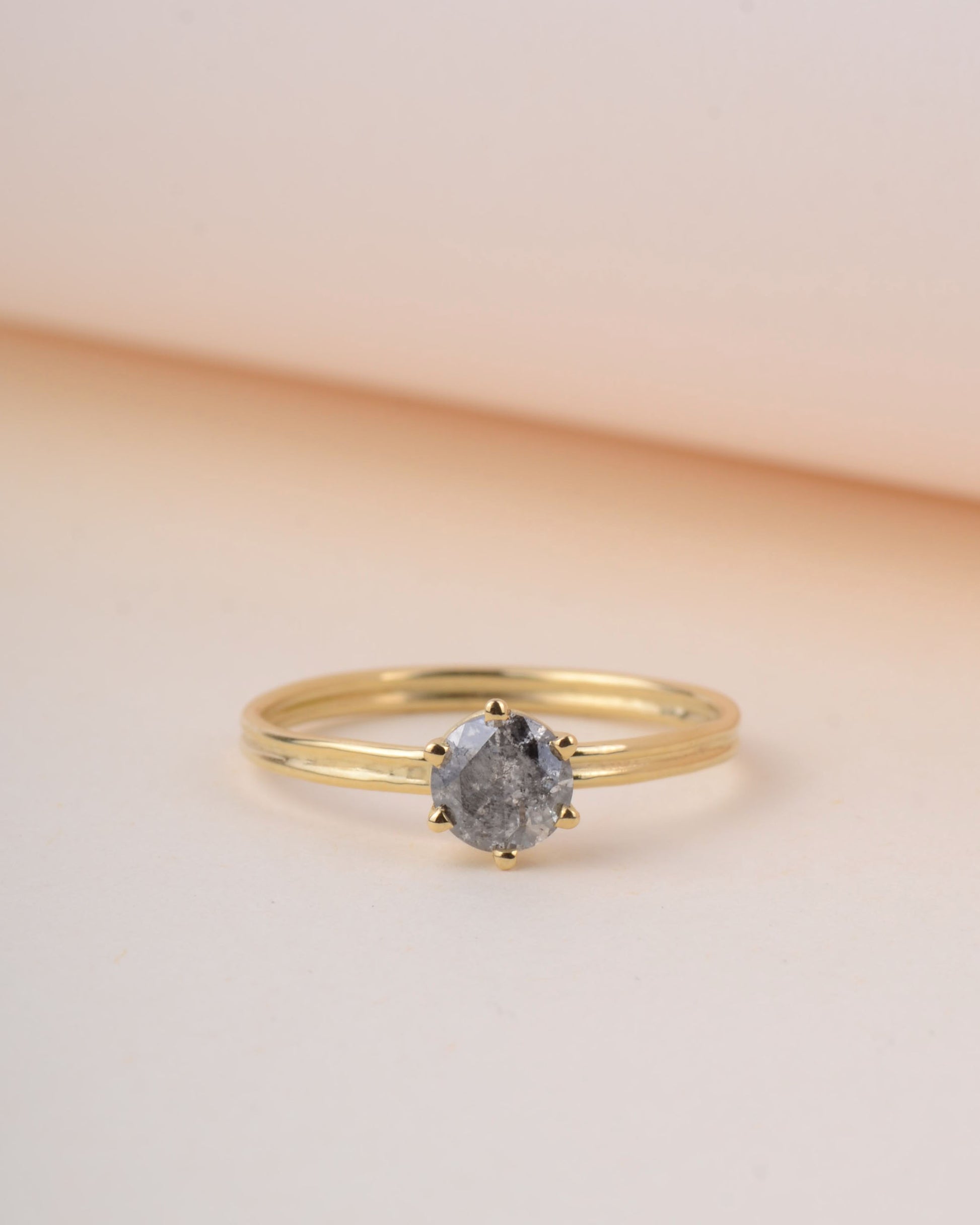 Een 18 karaat beauty. Deze one-of-a-kind salt&pepper diamant is een echte eye-catcher.