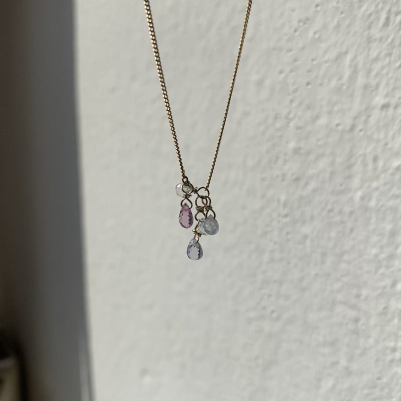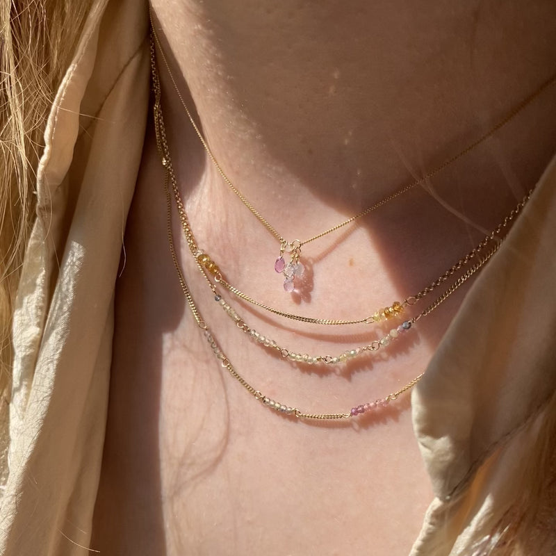 Een prachtige serie kettingen met verloop van lichte toermalijn tinten in de kleur geel, goud, roze. De nuances van de kleuren nemen je mee op een visuele reis. Het goud van de ketting met de kleuren van de edelstenen doen denken aan de krachtige kleuren van 'The golden hour'.