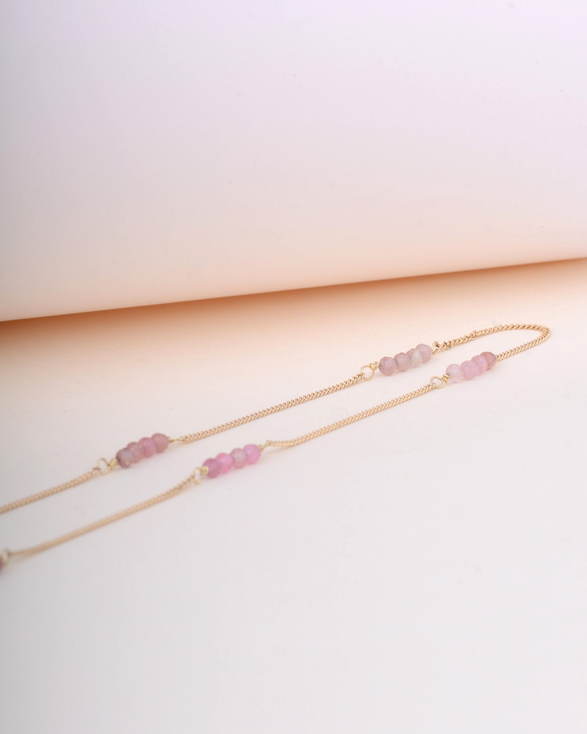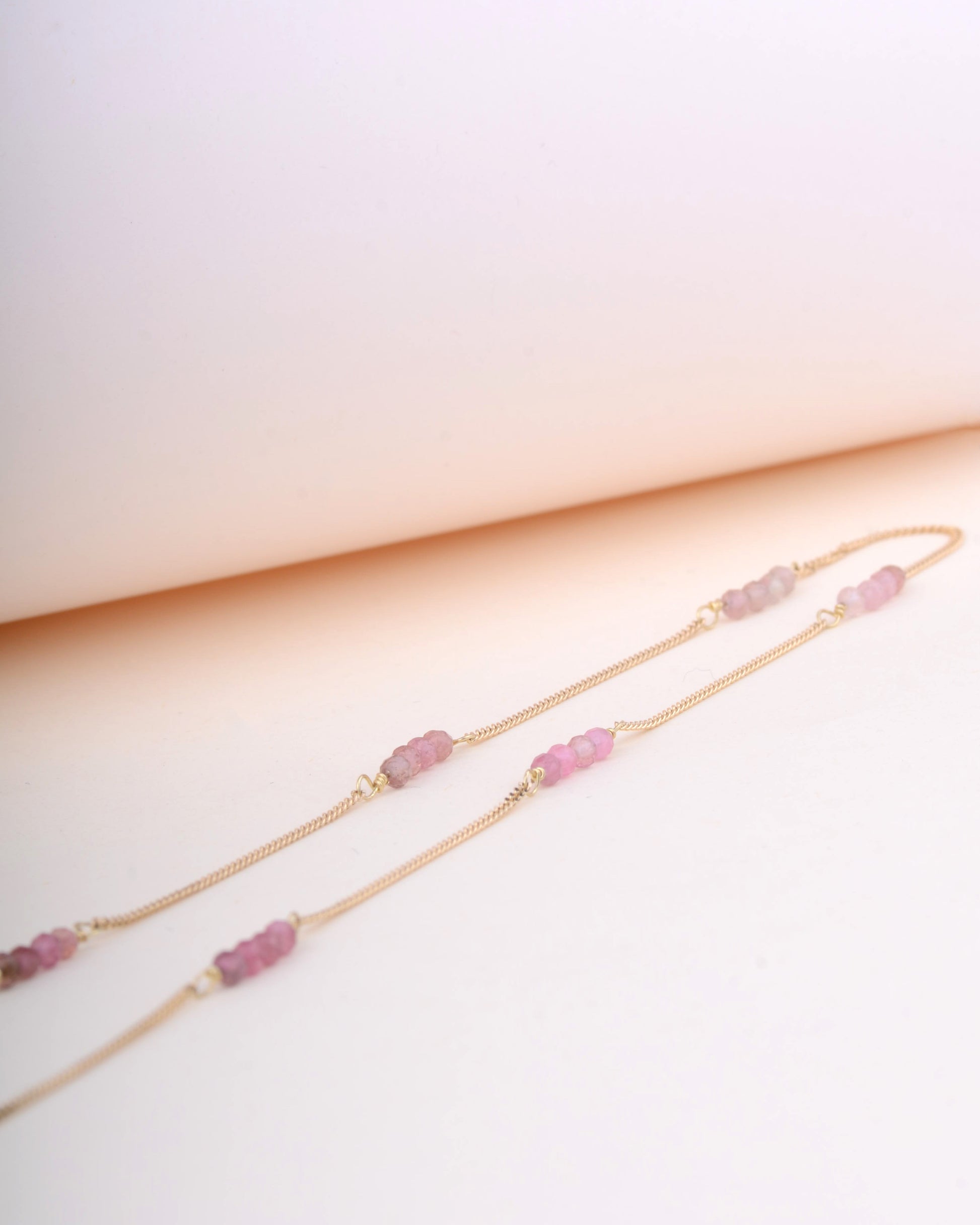 Een prachtige ketting met verloop van verschillende toermalijn tinten. De nuances van de kleuren nemen je mee op een visuele reis. Van lichtere tinten die doen denken aan de lente, tot diepere schakeringen die de rijke diepten van het bos oproepen.