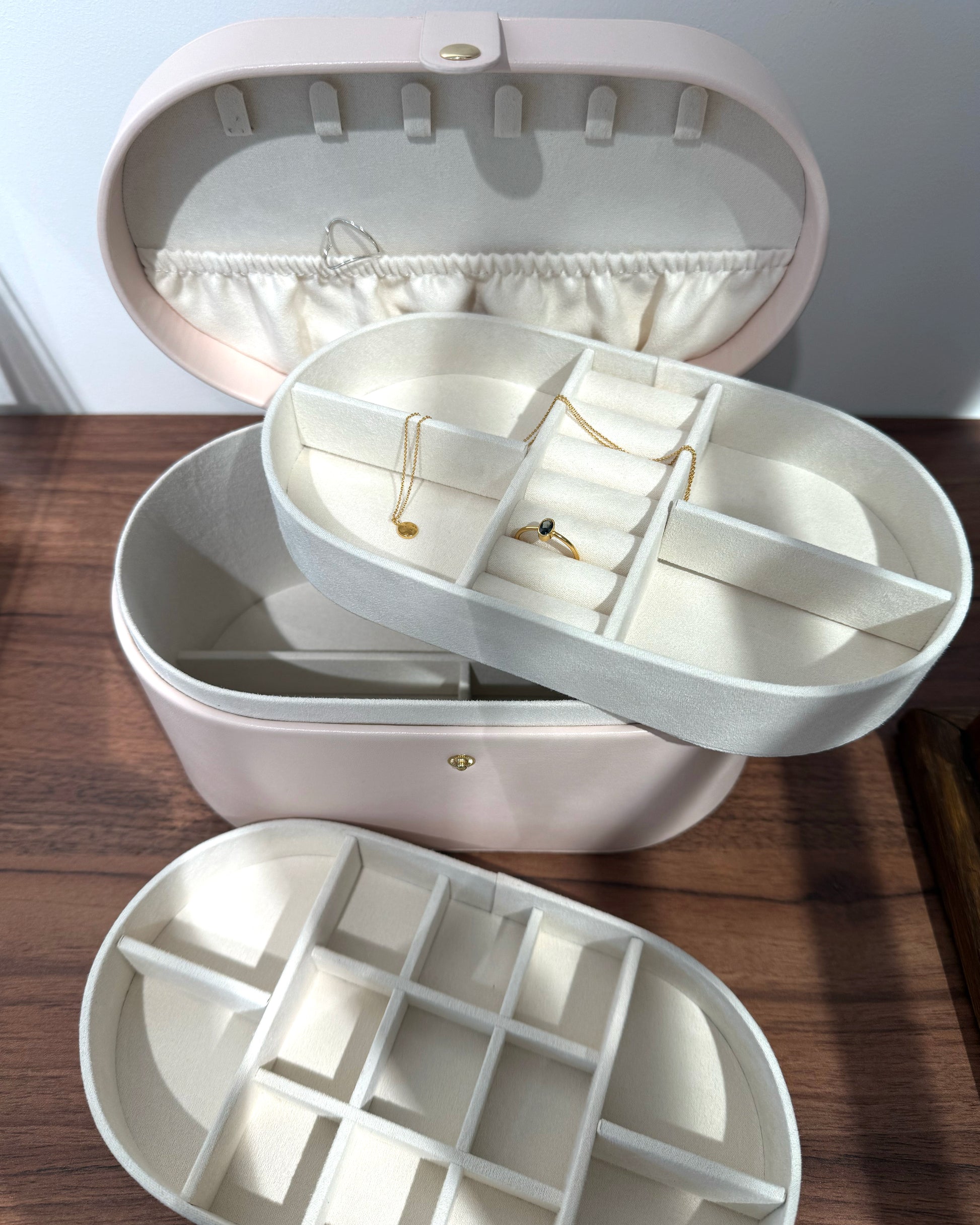 Luxe travel case om al je sieraden mee te nemen op reis. Met drie etagères is de case optimaal verdeeld om al je juwelen goed op te bergen.