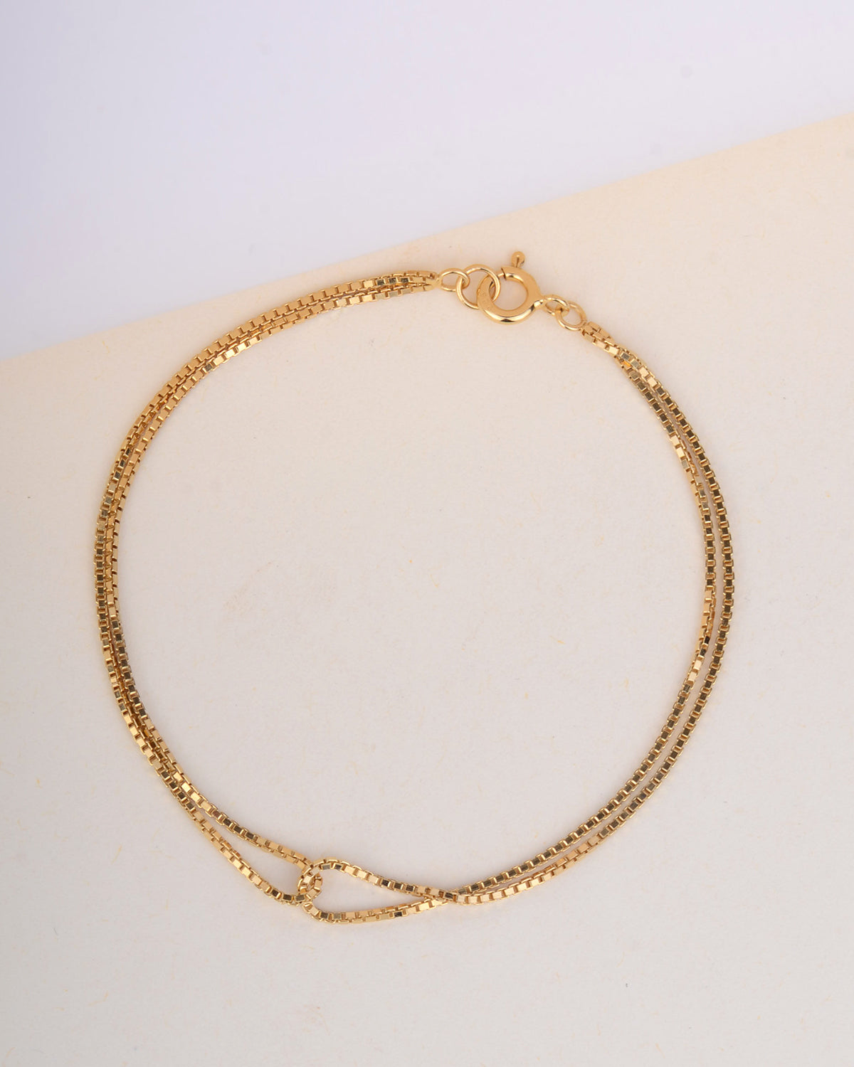 Een elegante armband gemaakt uit twee in elkaar gemaakte kettingen. De schakels haken speels in elkaar waardoor er een knoop effect wordt gesuggereerd. De Venetiaanse schakel zorgt voor subtiele schittering in het licht.