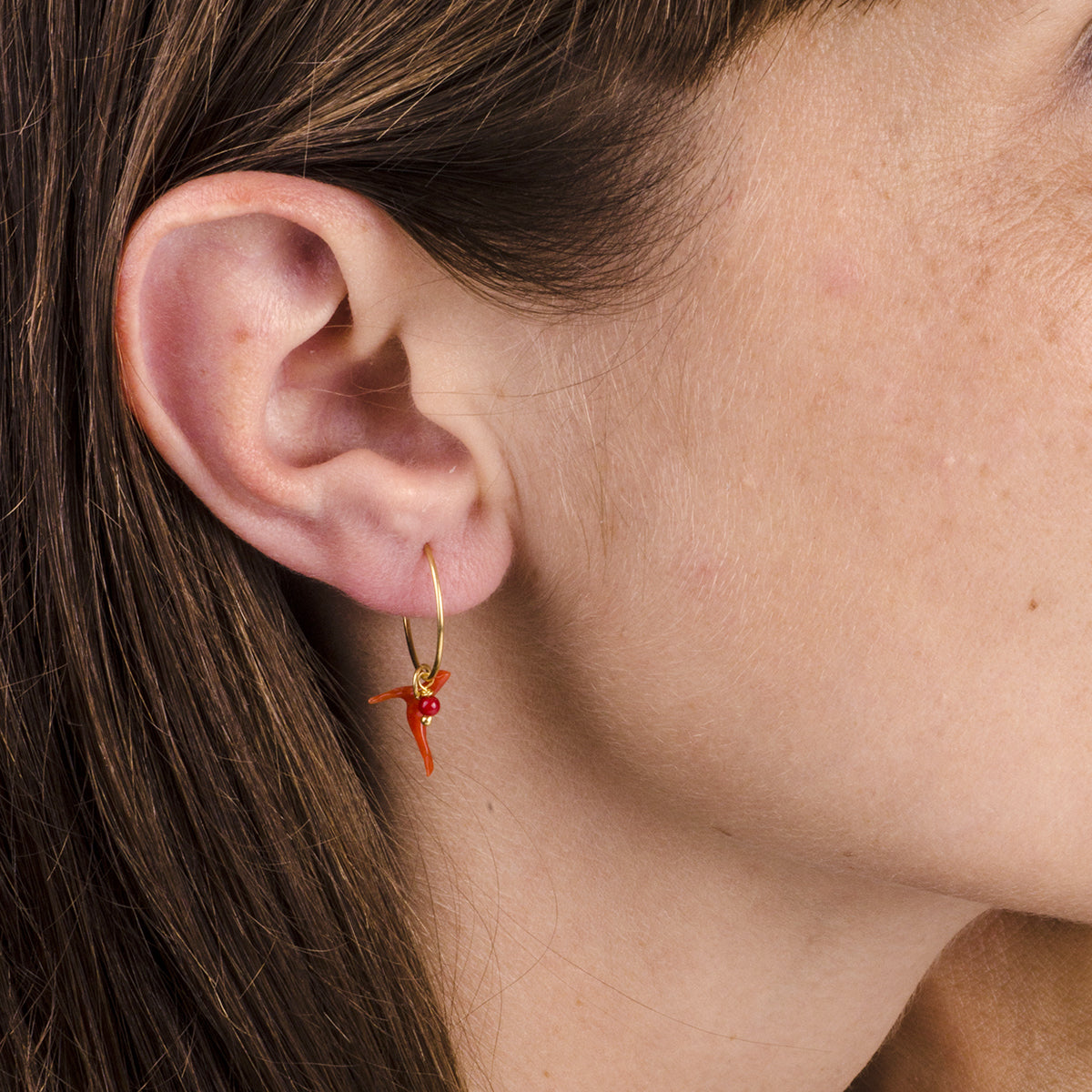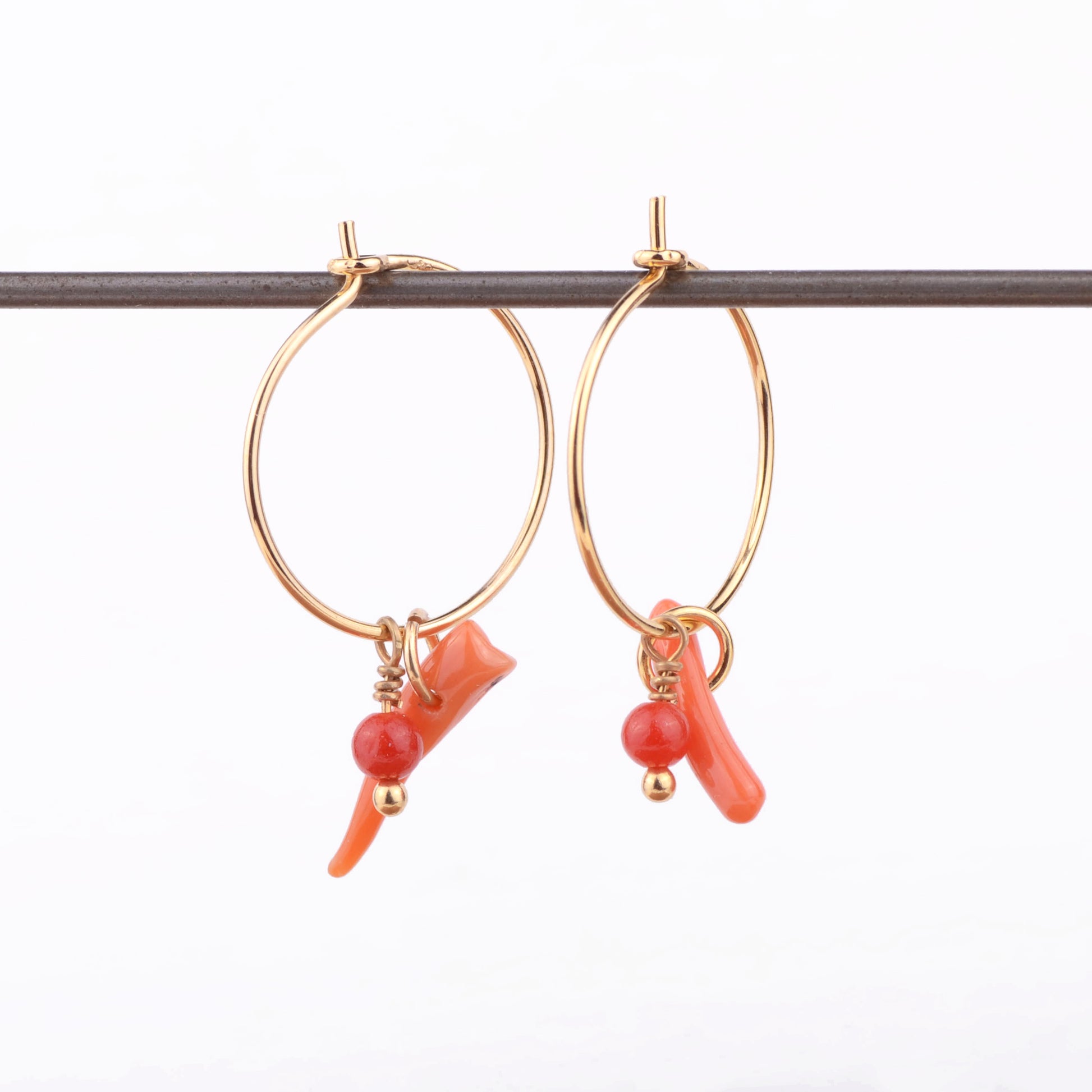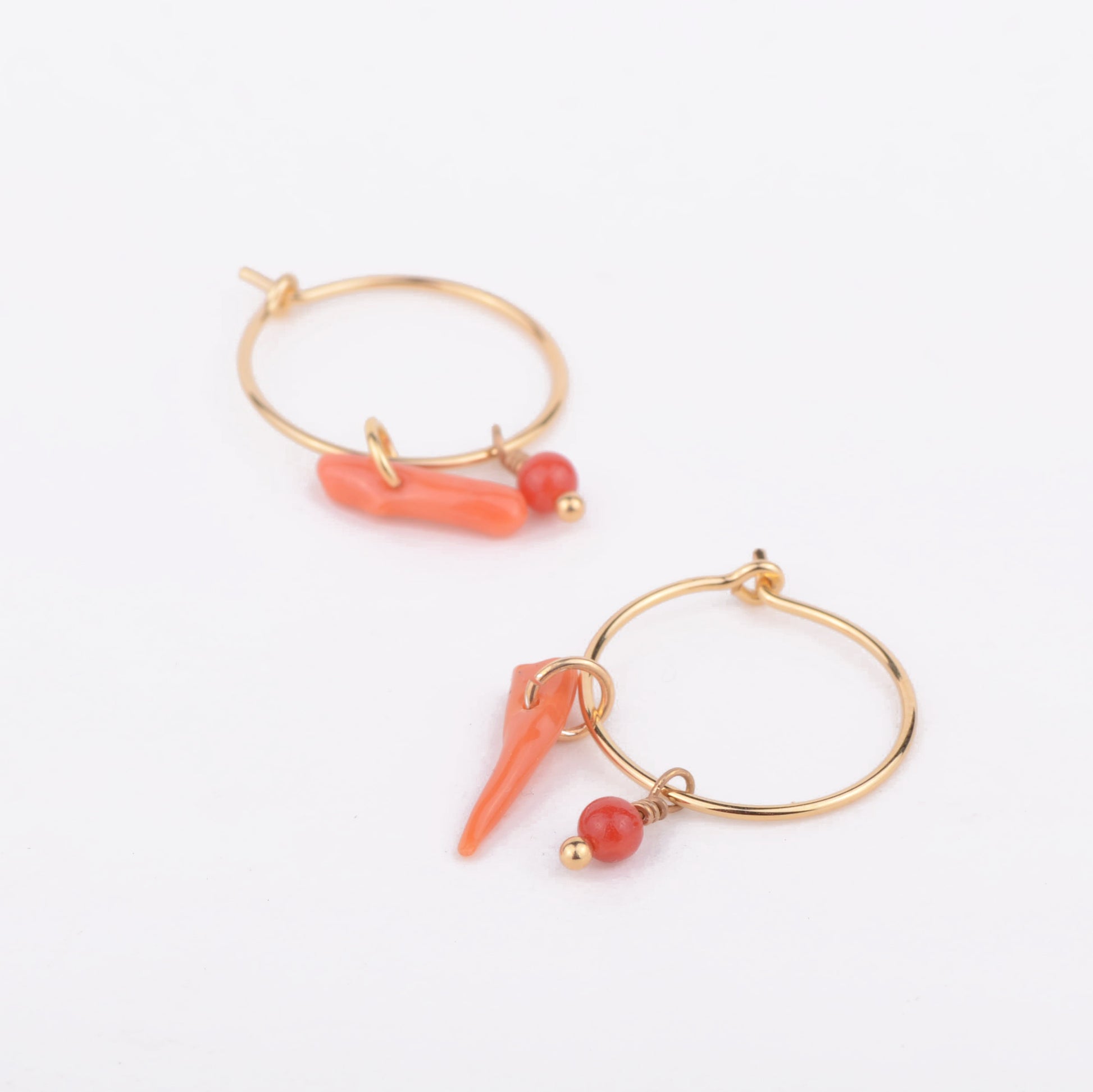 Een delicate en verfijnd paar oorbellen met een unieke mix van rood koraal. Koraal is een natuurproduct en dat maakt elke oorbel uniek. De vorm en grootte van het koraaltje kan daarom afwijken van de foto.
