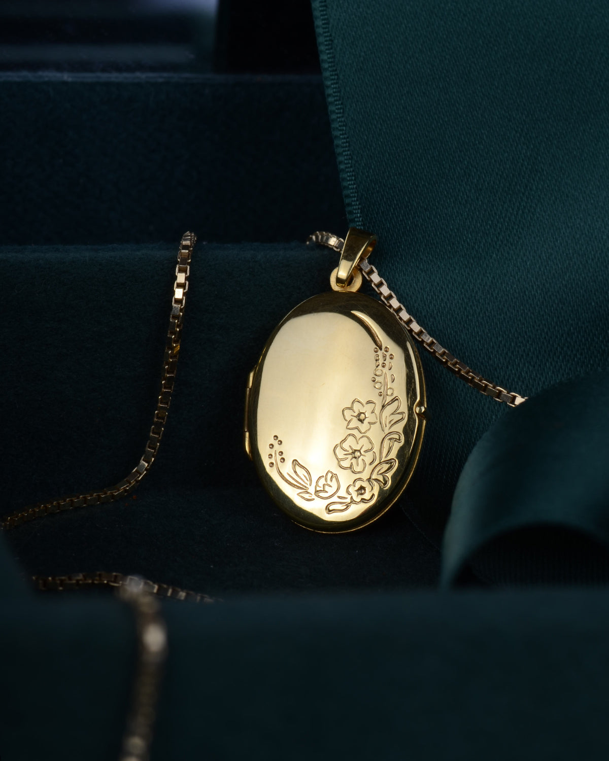 Een medaillon met een gegraveerde bloemenrand. Deze black friday gratis handgravure met klassiek lettermonogram.