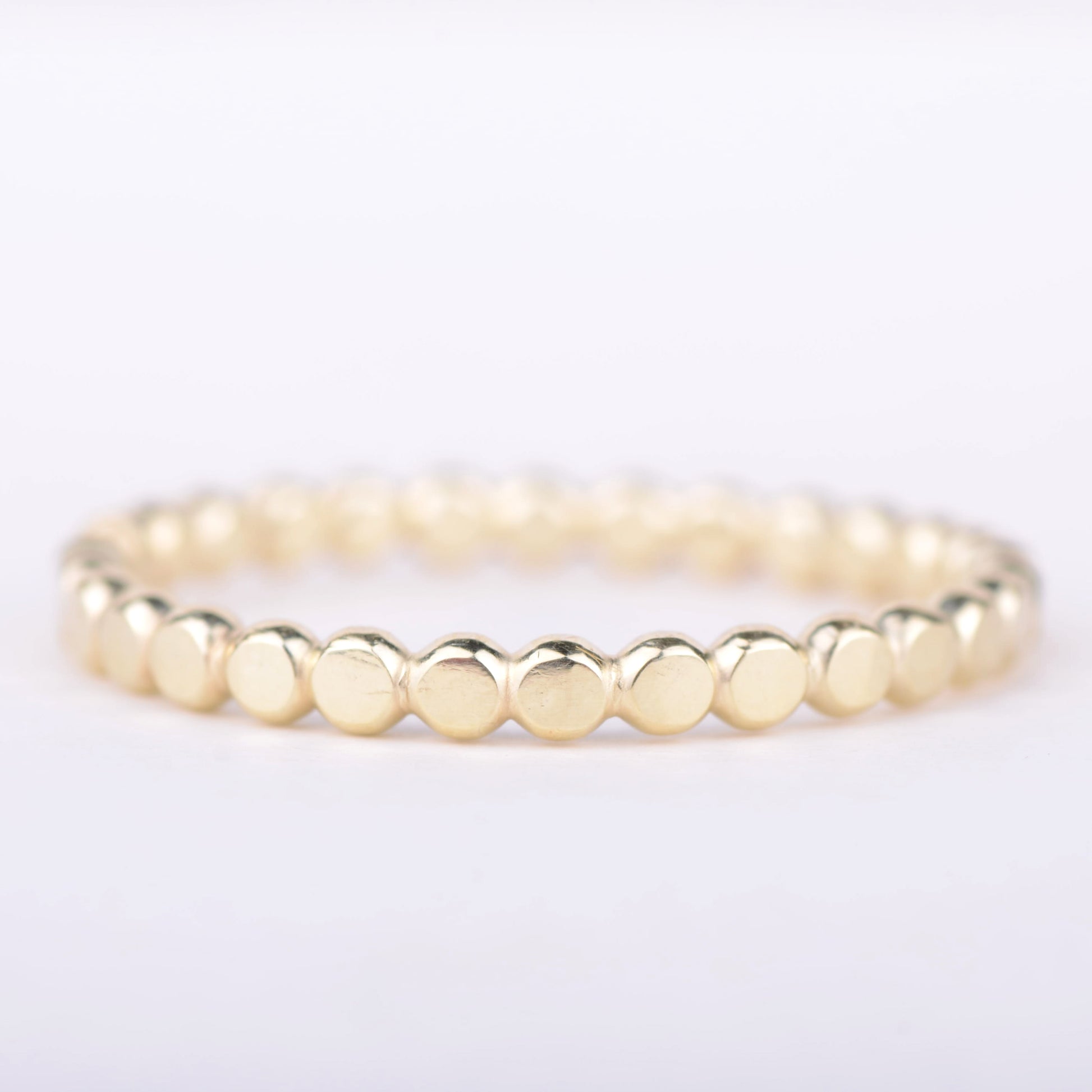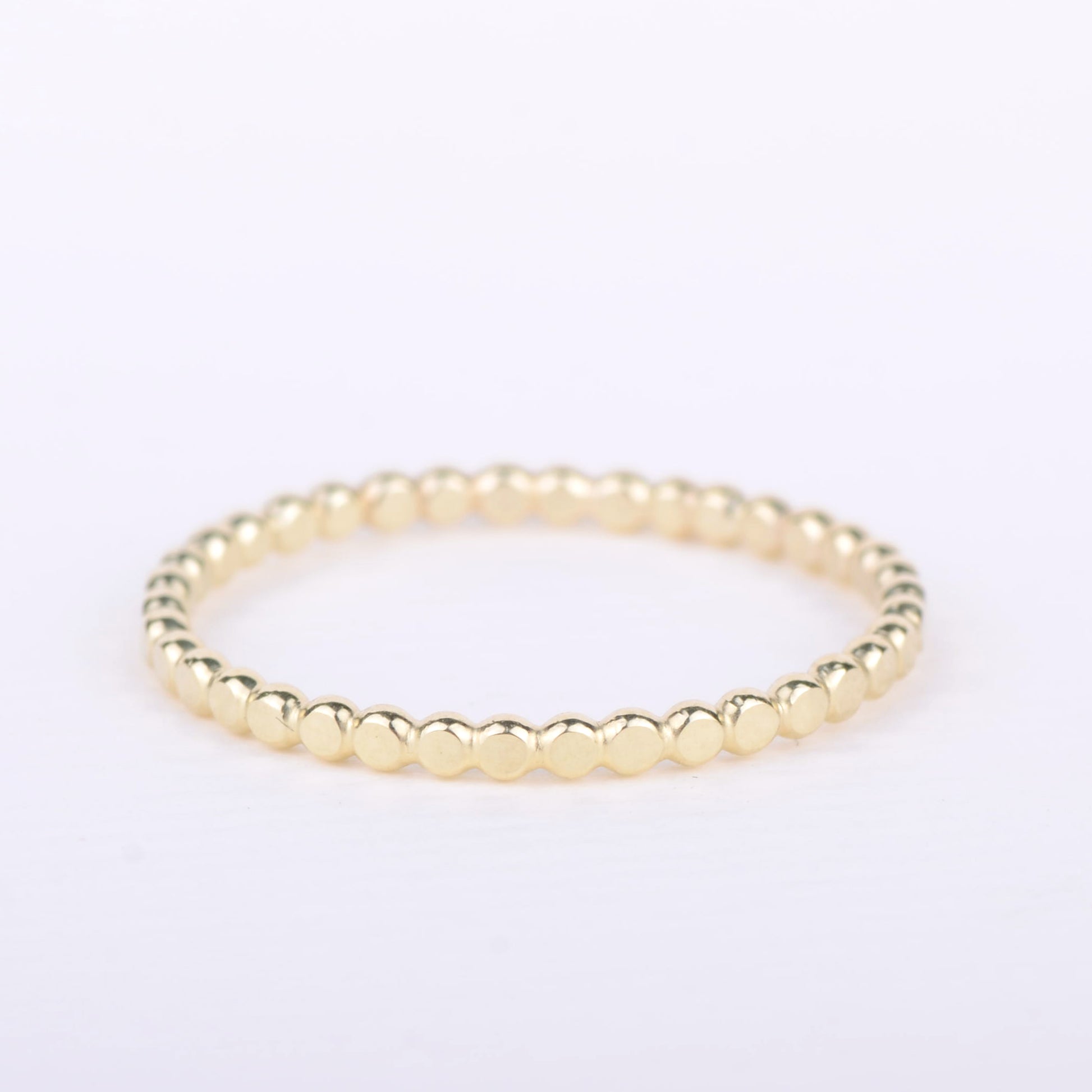 Een prachtige ring als een rits parels gemaakt van 14k goud. Lichtjes plat gehamerd krijgt de ring een mooie glans. Perfect te combineren in een stack.