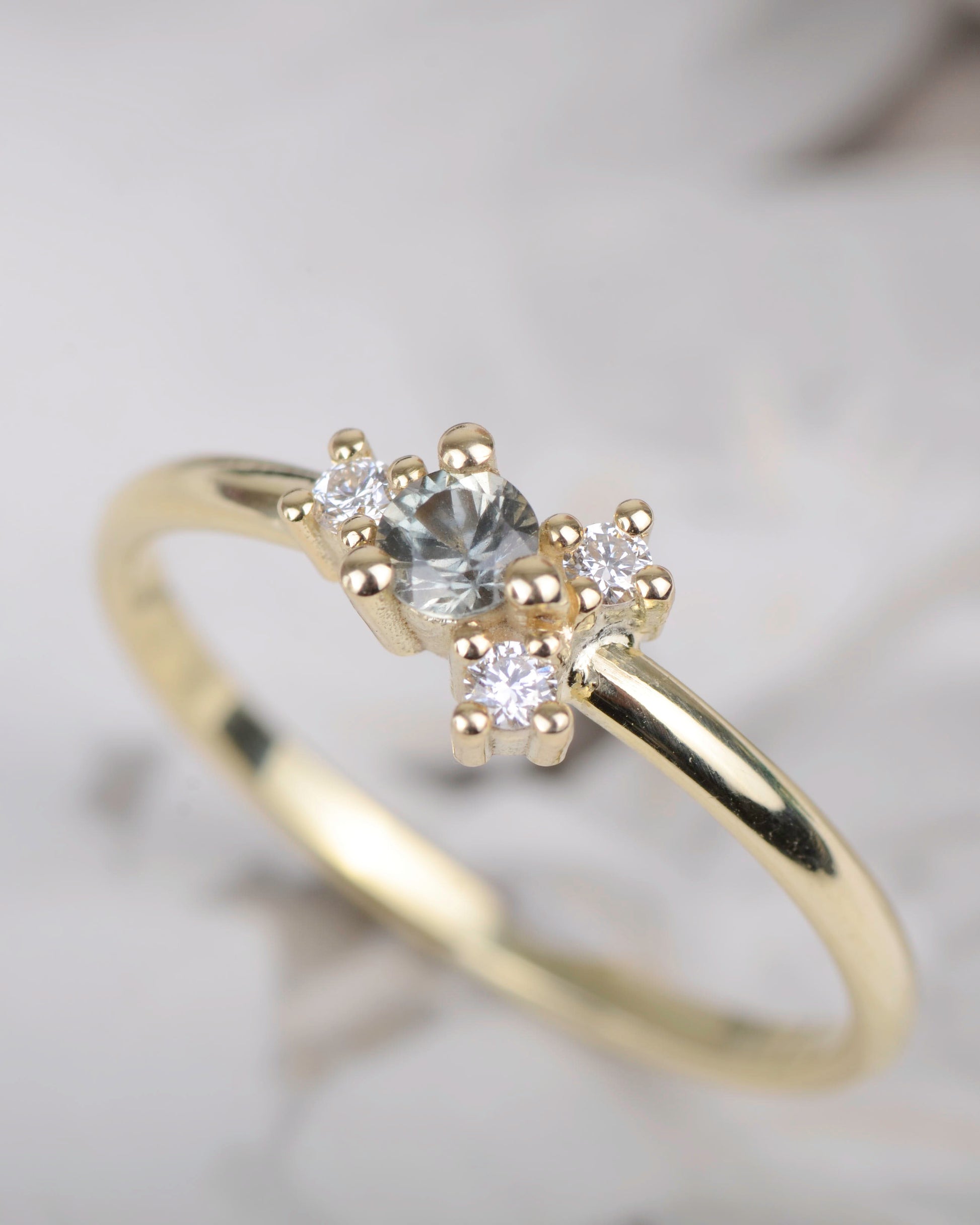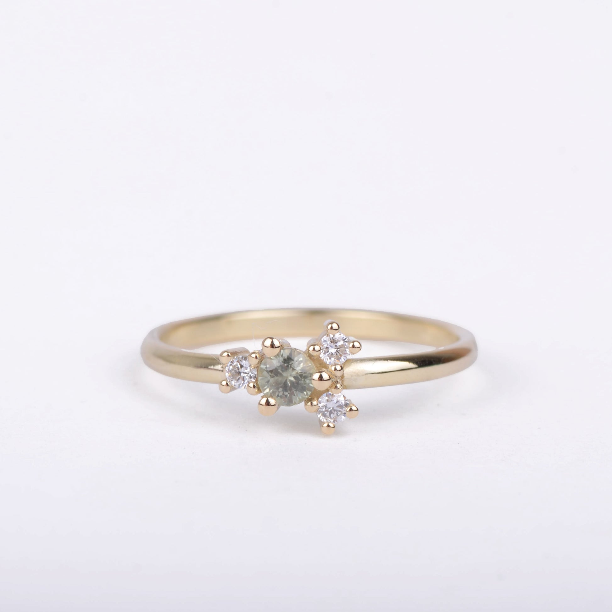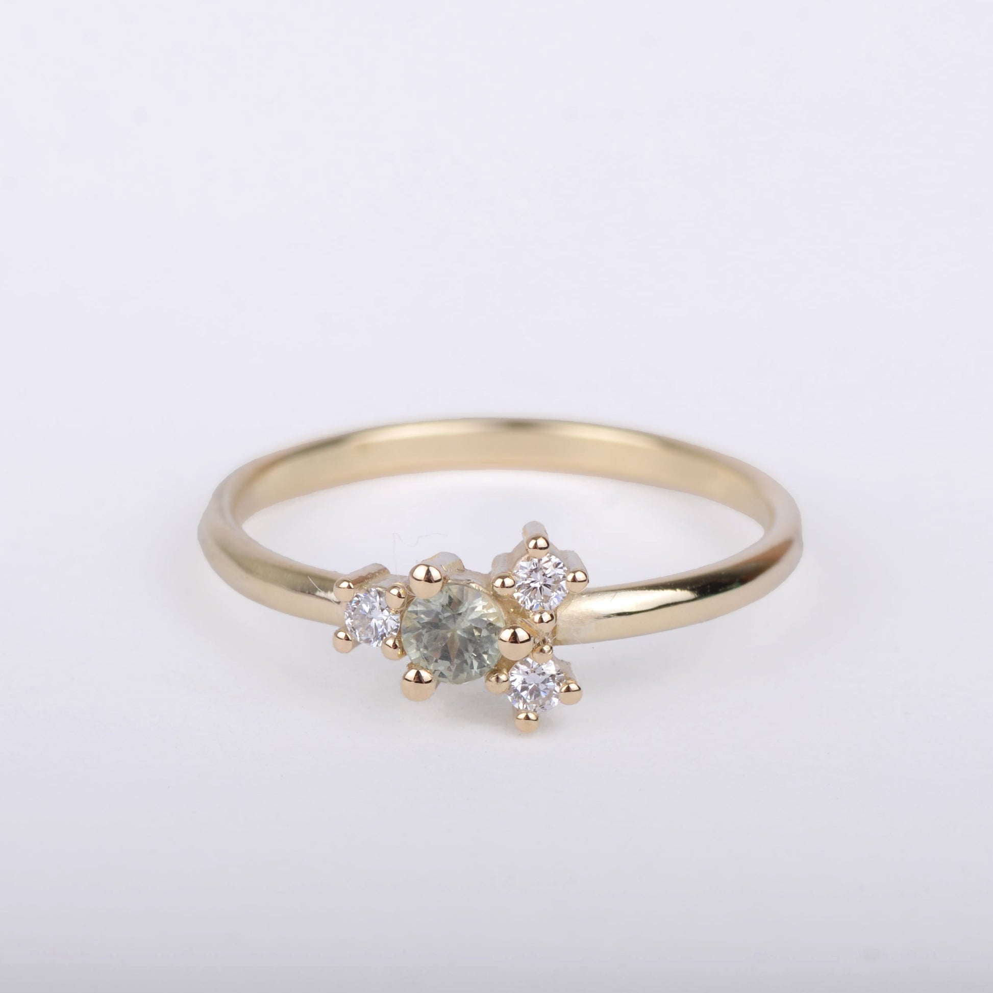 Als een frisse ochtend in de lente straalt deze ring meadow. De lichte kleuren van de edelstenen geven een zachte uitstraling aan deze 14 karaat recycled geelgouden ring.