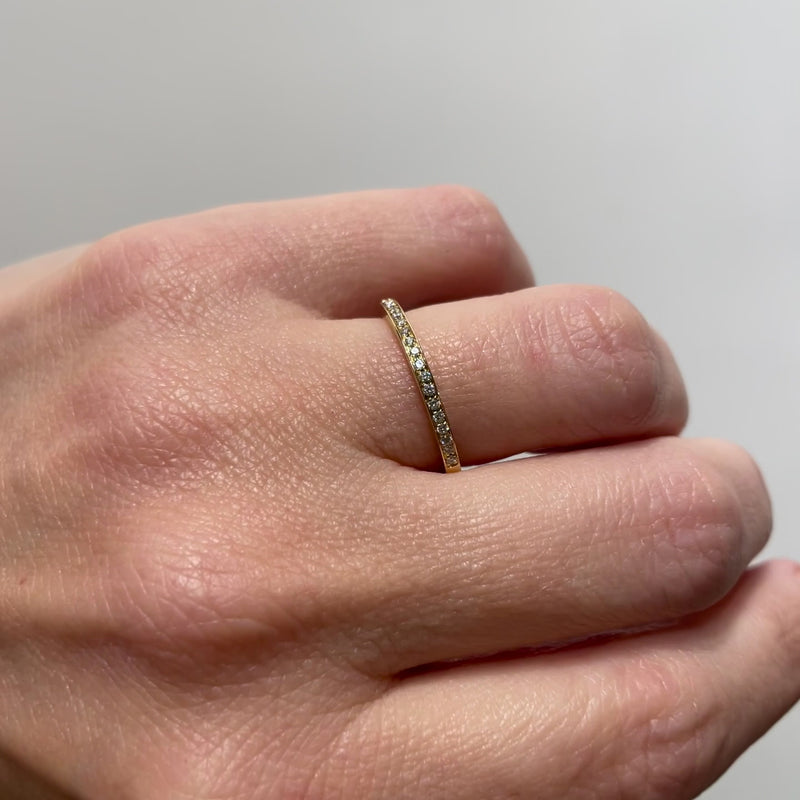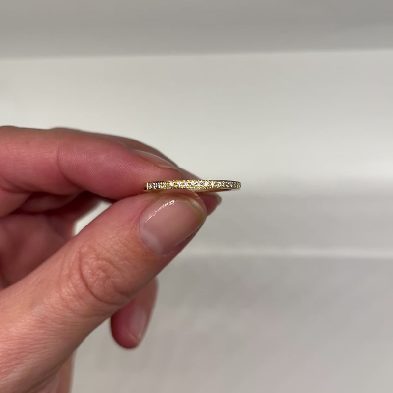 Een sublieme ring met 27 diamantjes gezet over de helft van de band. Deze ring is een prachtige aanschuifring in een set en maakt elke blik op je hand een waar feest.